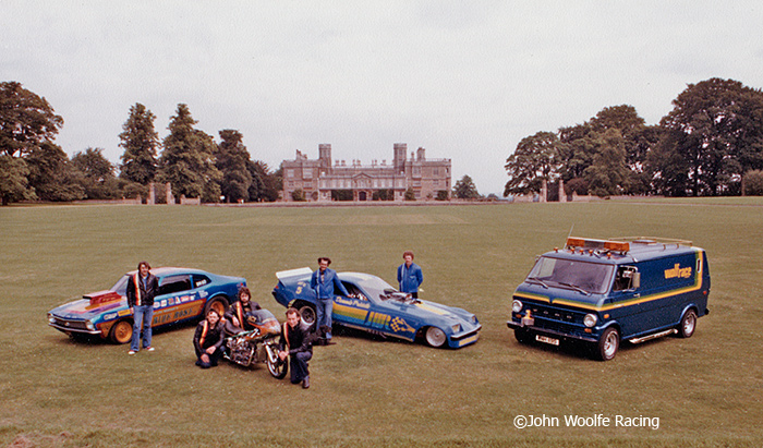 This image was taken by Roger Gorringe during a PR shoot for John Woolfe Racing (Image ©). From Left to Right: Melvyn Wooding and his Blue Rose Ford Maverick, Ian, Derek & Eddie Keightly with the Pegasus-Norton, and finally last but not least Dennis Priddle, Barry Duffty and the JWR Monza Funny Car.